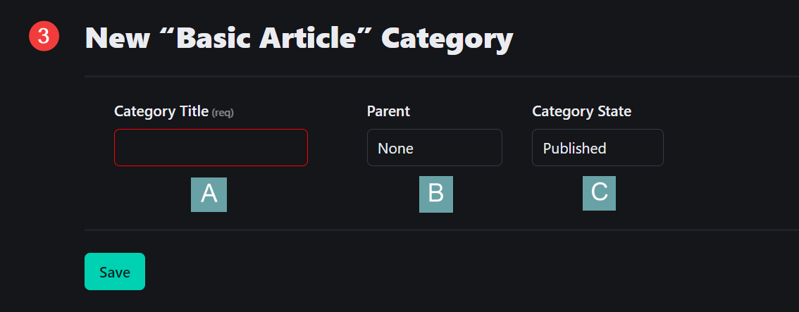 - A. Category Title - The name that will appear as an option when creating or editing content items.